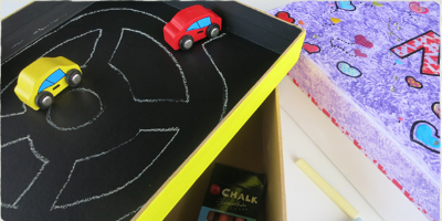 When it is all dry, fill with your favourite creative supplies to keep the kids entertained. Don’t forget to include some chalk so that they can write and draw in the lid. You're now ready to roll! Your new travel box is all ready. Have fun!