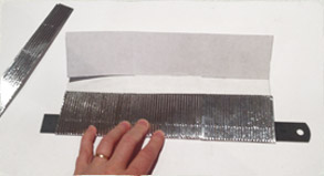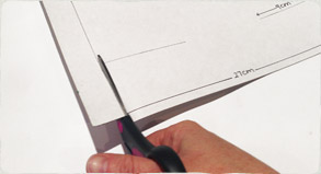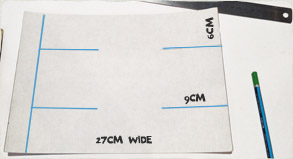 Position your A4 sheet horizontally (or landscape), and on the reverse side, mark the following lines: 1 vertical line 27cm from the right hand side, and 4 horizontal lines 9cm long, positioned 6cm from the top and bottom of the sheet as shown.
