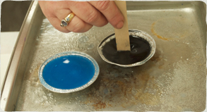 To add colour, float the individual wax trays on a pan of boiling water and continue to simmer on a low heat. Add oil pastels of your colour choice, blending as appropriate until you’ve reached your desired shade. Be sure to stir and mix the pastels through thoroughly for a nice smooth consistency.