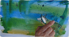 Wash over the dogs body and floor in the dark olive green and add a vertical streak to represent the trunk of a tree parallel to the upright beam of the veranda. With a fine wet brush, wash over the dog’s body and floor in the dark green you mixed earlier. Dip a toothbrush into the green and using your thumb flick the paint onto the image across the top layer. The dryer the paper the better this will work..