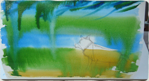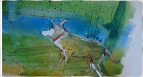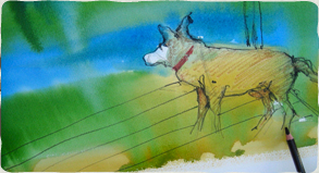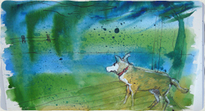 Add some yellow ochre across the body of the dog, leaving his head mostly white if possible as well as the very bottom of the page. Stand the image up vertically and let the colours drip down the page
