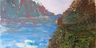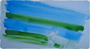 Wet a large flat brush with water and use it to flood the paper where the sky (the top of the page) and the river (a thin strip across the middle of the page) will lie. Now load the brush with blue watercolour and sweep it across the wet areas. This technique is known as ‘wet in wet’ painting. Ask your students to consider the image, taking note of what is in front and what is behind.
