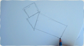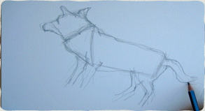 We want to recreate the dog the bottom left quadrant of the paper. Have your students consider the size and scale of the dog. Break the dog into three simple shapes, a square for the head, triangle for the neck and rectangle for the body and demonstrate how to sketch with a light graphite pencil.