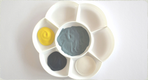 Pour a small amount of each of your paint colours into your paint palette. Mix the black and white paint together to make grey.
