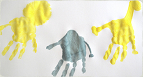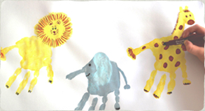 Using your paint brush, add the animal body parts to your hand prints. A head, mane and tail to the lion, a trunk and ear to the elephant, and a long neck to the giraffe.