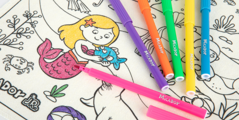 Themed Placemats: Two per pack (45cm x 30cm) in Mermaids/Backyard or Dinosaurs/Camping designs. Includes 6 Totally Washable Fabric Markers. One mum told us they solved her "no drawing at dinner" rule overnight – now she actively encourages it. SRP $12