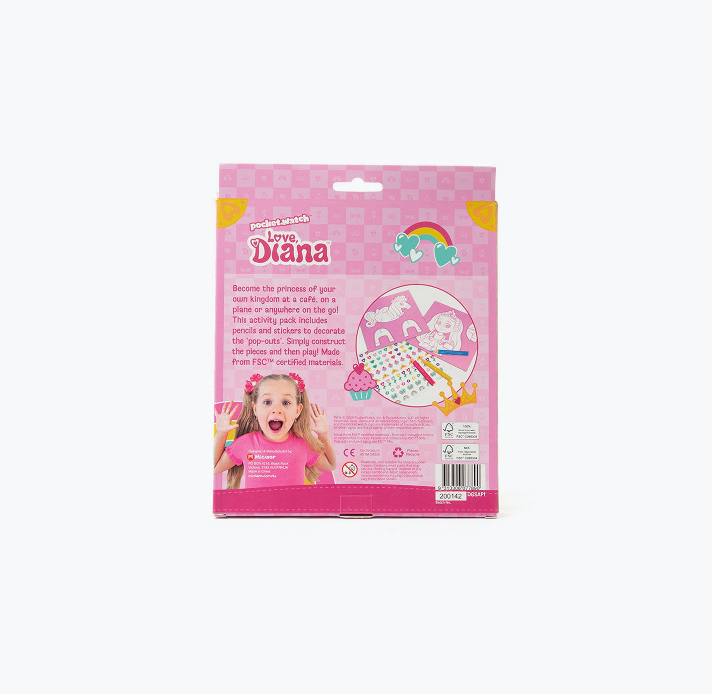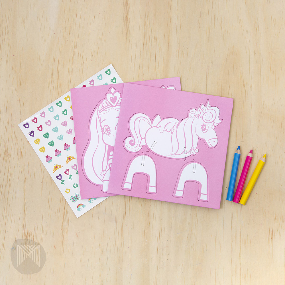 - Includes 2 x ‘pop-out’ cardboard characters, 3 colored pencils and a sticker sheet