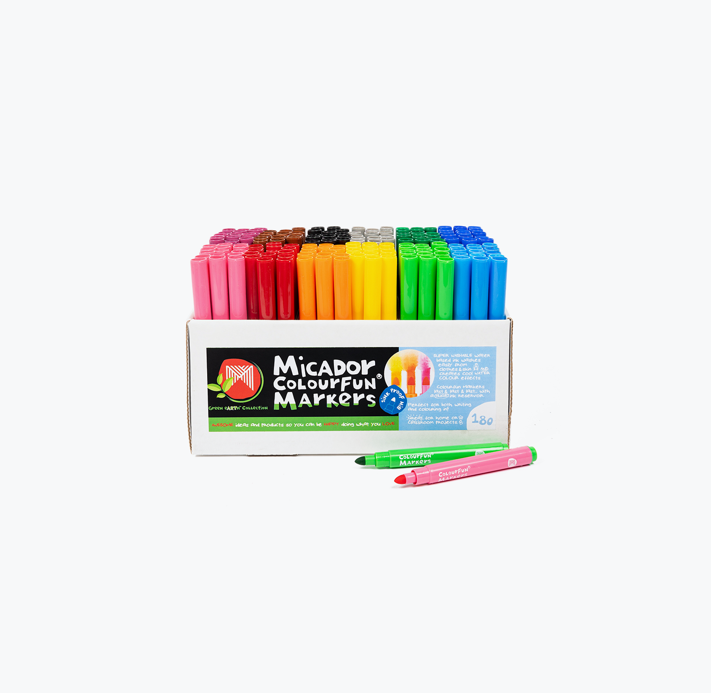 Micador's best-selling Colourfun Markers are made with super-washable ink that washes easily from skin and clothes. Sink proofs nibs are designed for durability and the large ink reservoir makes sure they last and last. Made with at least 15% recycled plastic and 100% recyclable plastic and packaging, Colourfun Markers are a sustainable must-have for home or school.