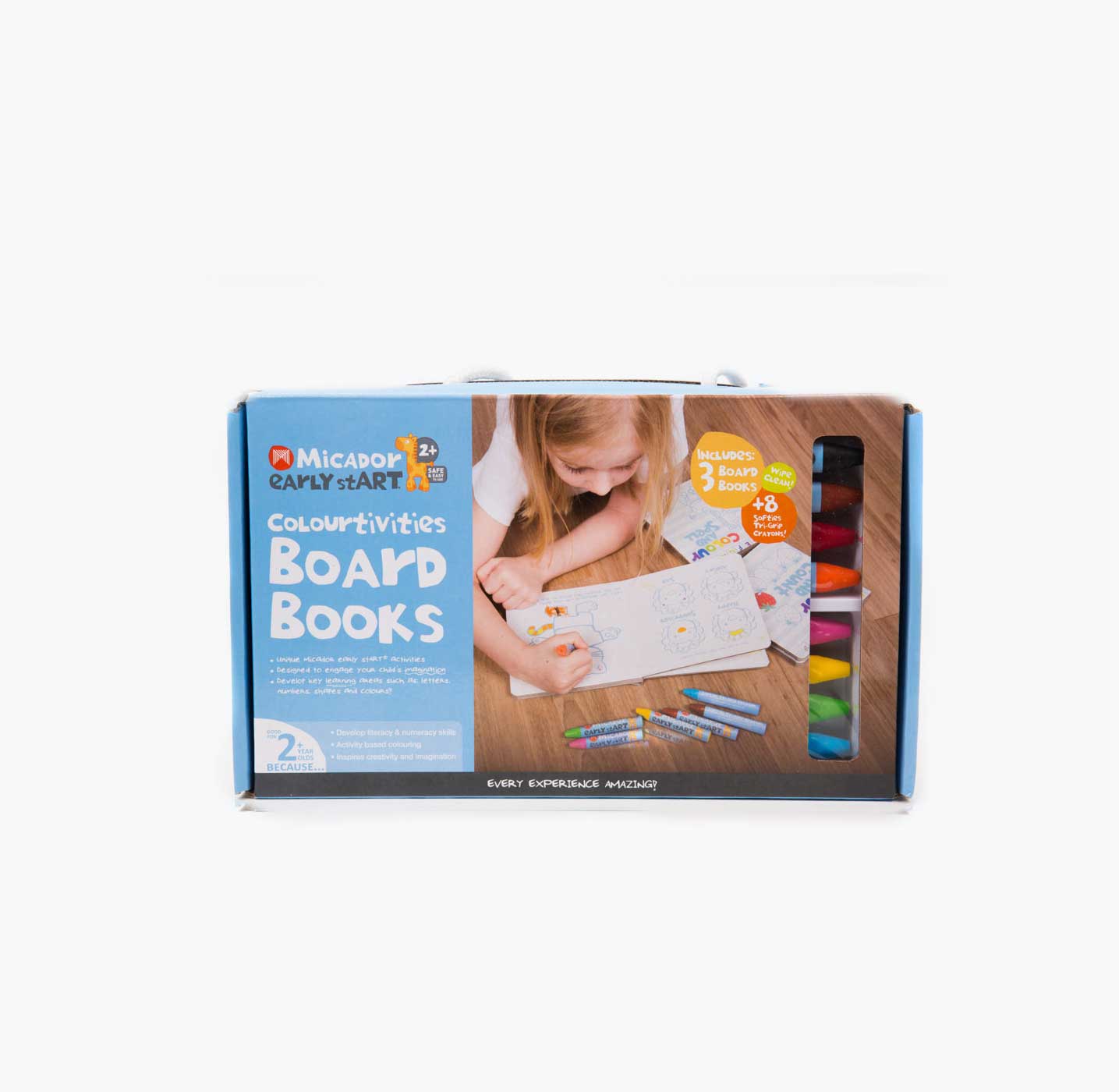 - Includes 3 Board Books with over 30 unique activities plus 8 Tri-Grip Crayons
