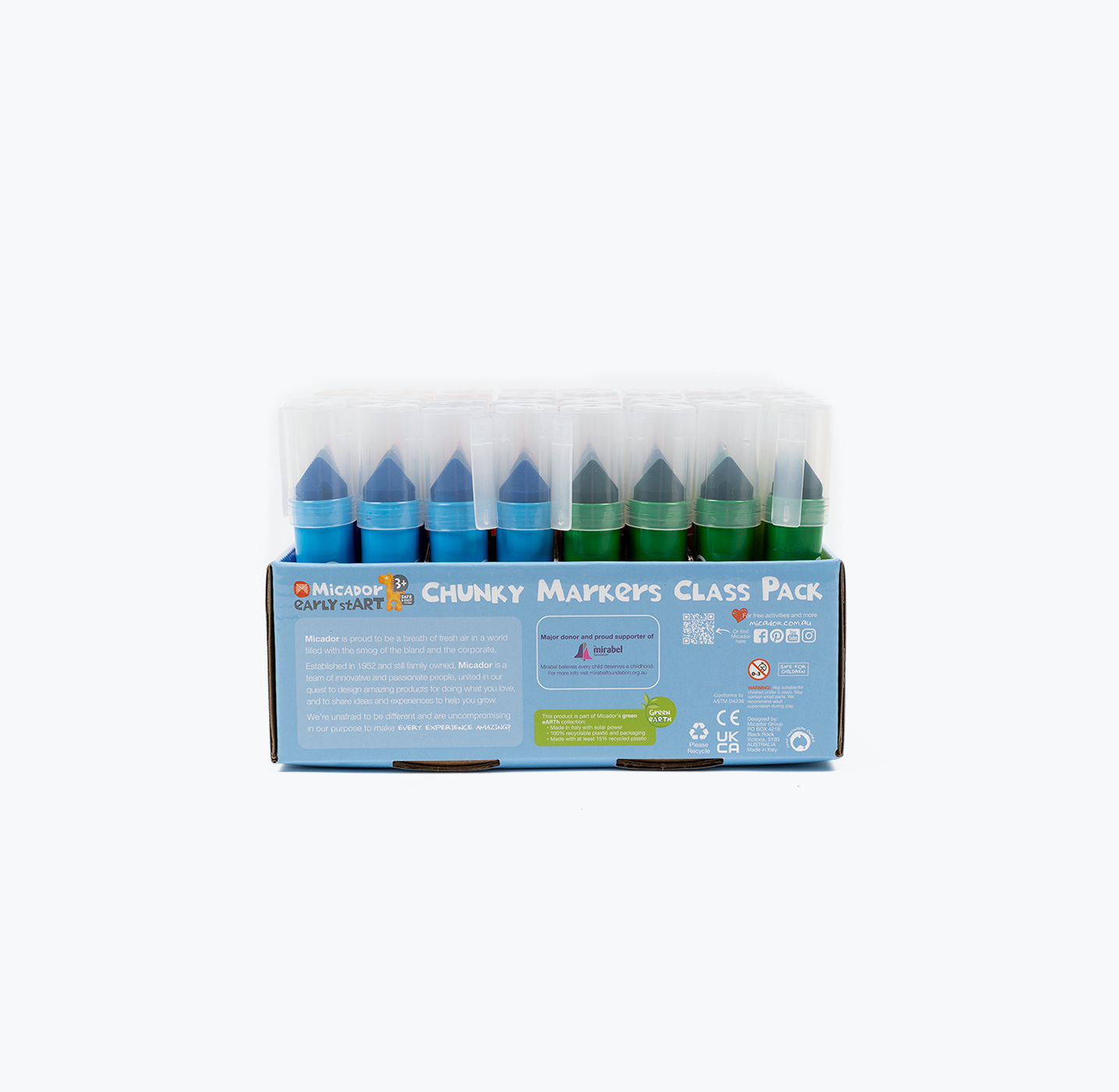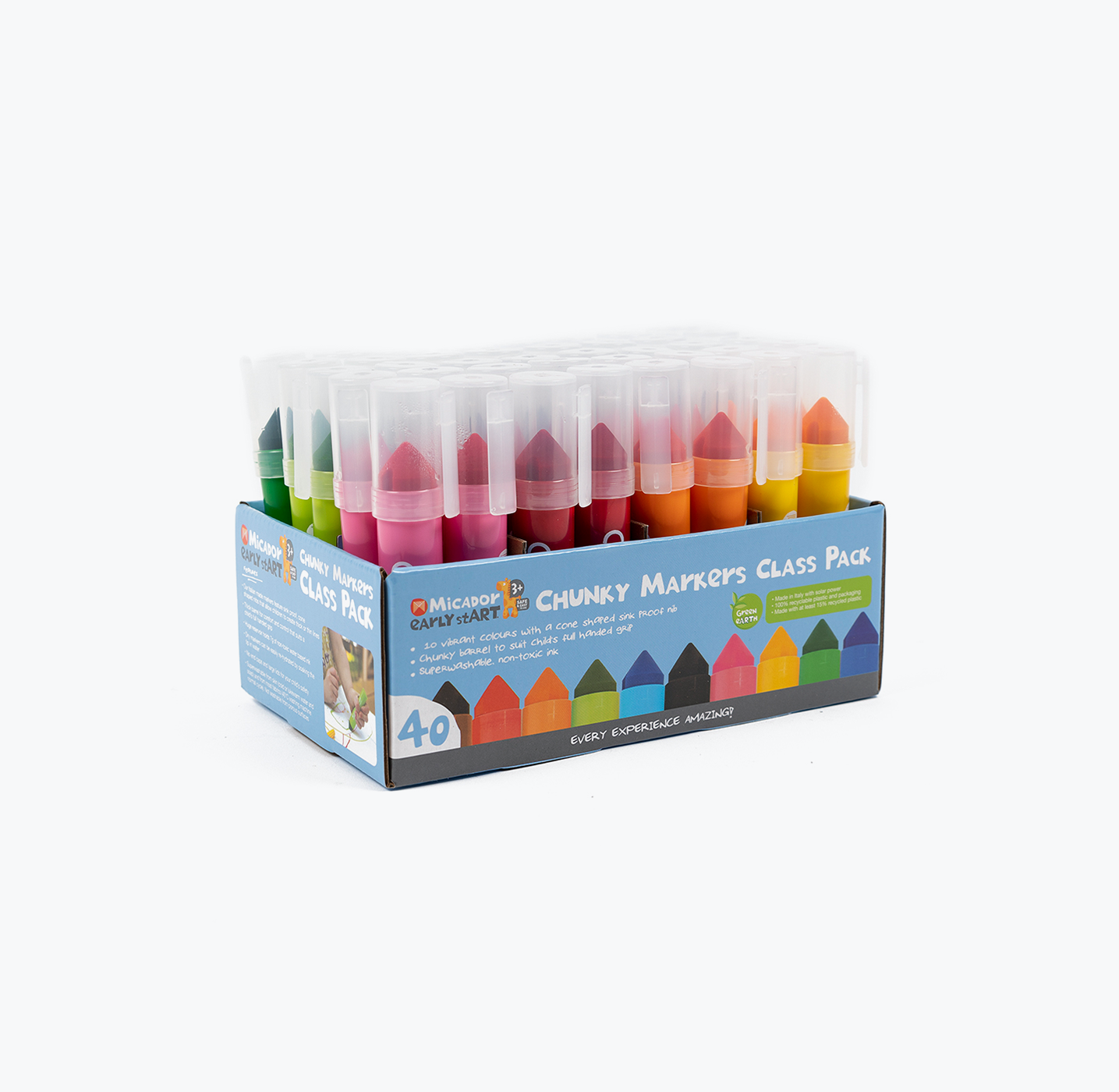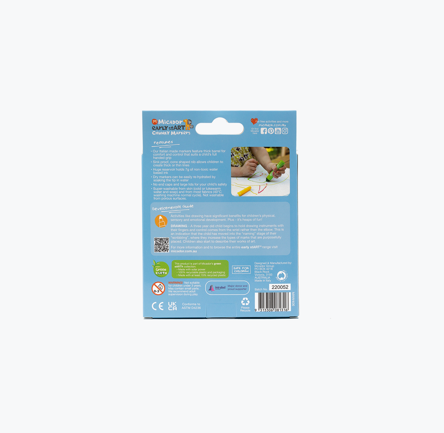 These practical, safe and easy-to-use markers are perfect for little hands. The thick barrel suits a child’s full handed grip and the cone-shaped, indestructible nib allows children to draw thick and thin lines. The ink is water-based and super-washable from skin and most fabrics with lukewarm water, plus dry markers can be easily re-hydrated by dipping the nib in water! With no end caps and large lids for safety, they are suitable for children 3+ years. Available in Wildlife and Playground editions in packs of 5 or a handy class pack of 40 ideal for home, parties or the classroom.