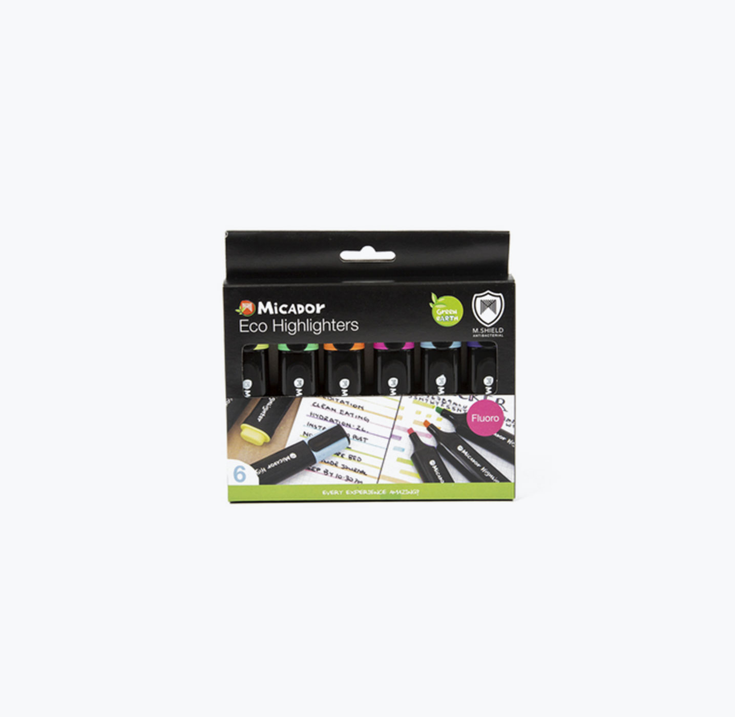 Fluoro highlighters are a must-have for the classroom, office and home. Bright, water-based ink stays vibrant on paper. Highlighters are made with post-consumer recycled material, and are packaged in a recyclable cardboard box. Includes M.SHIELD Antibacterial additives proven to kill bacteria.