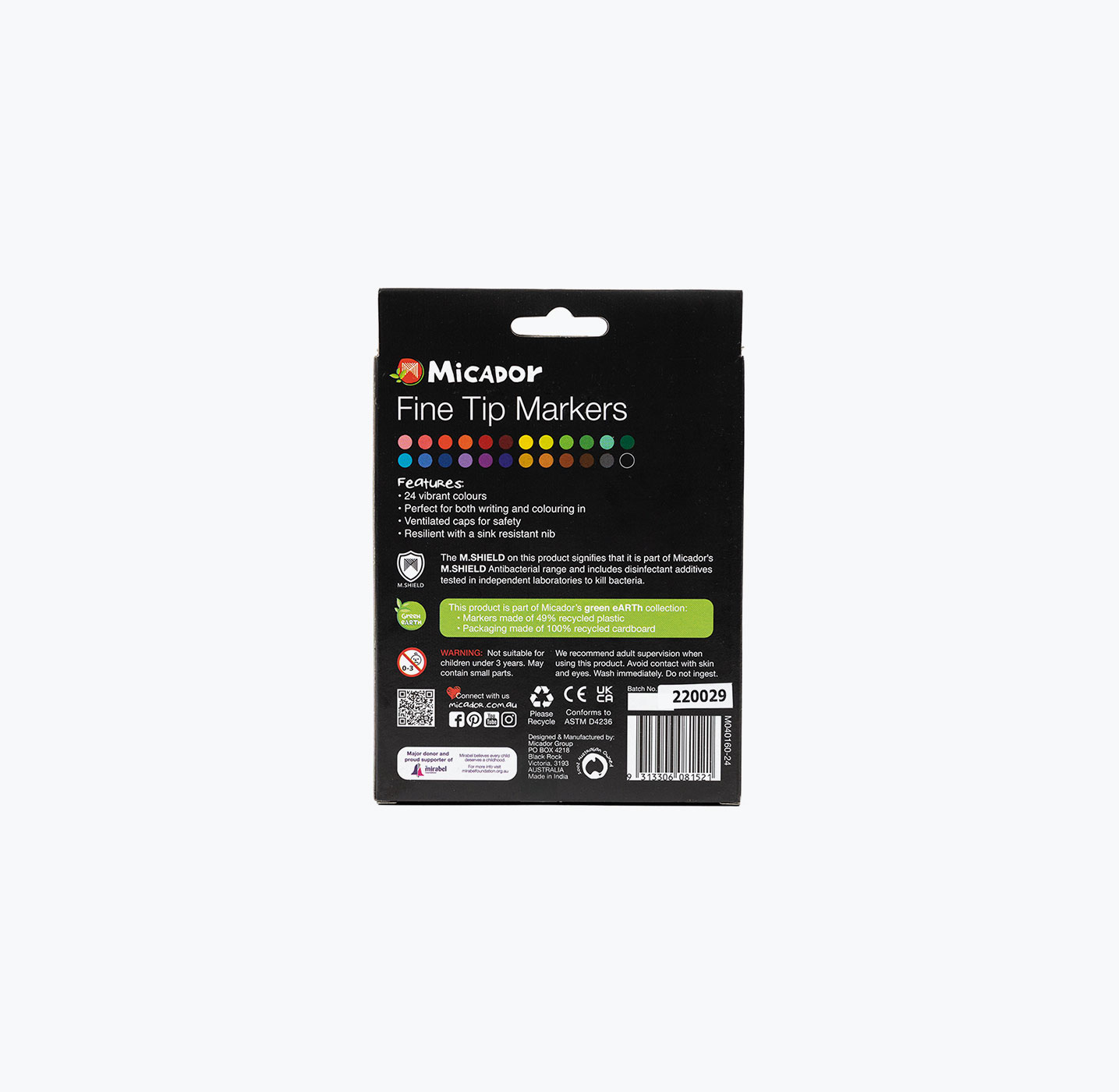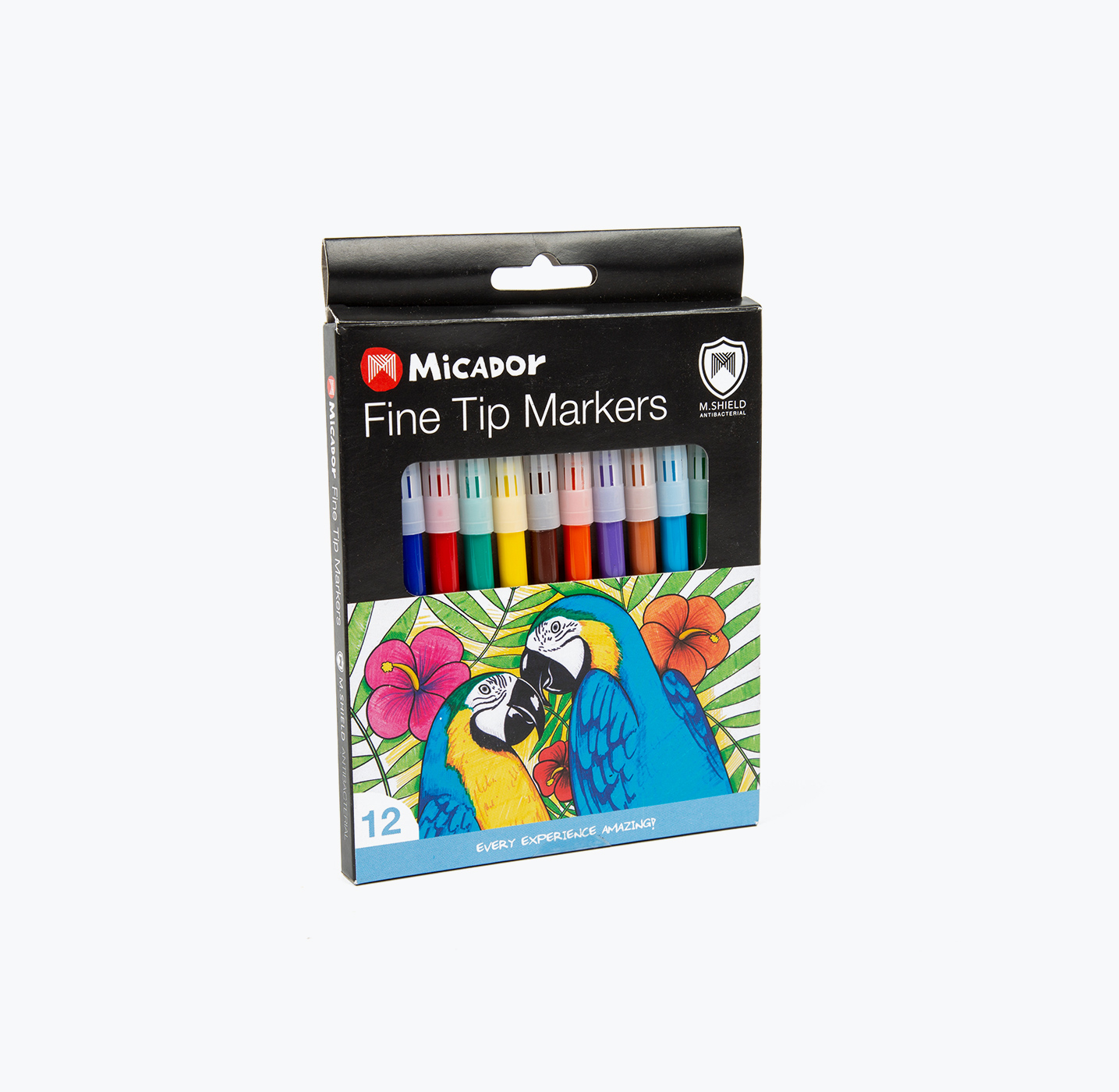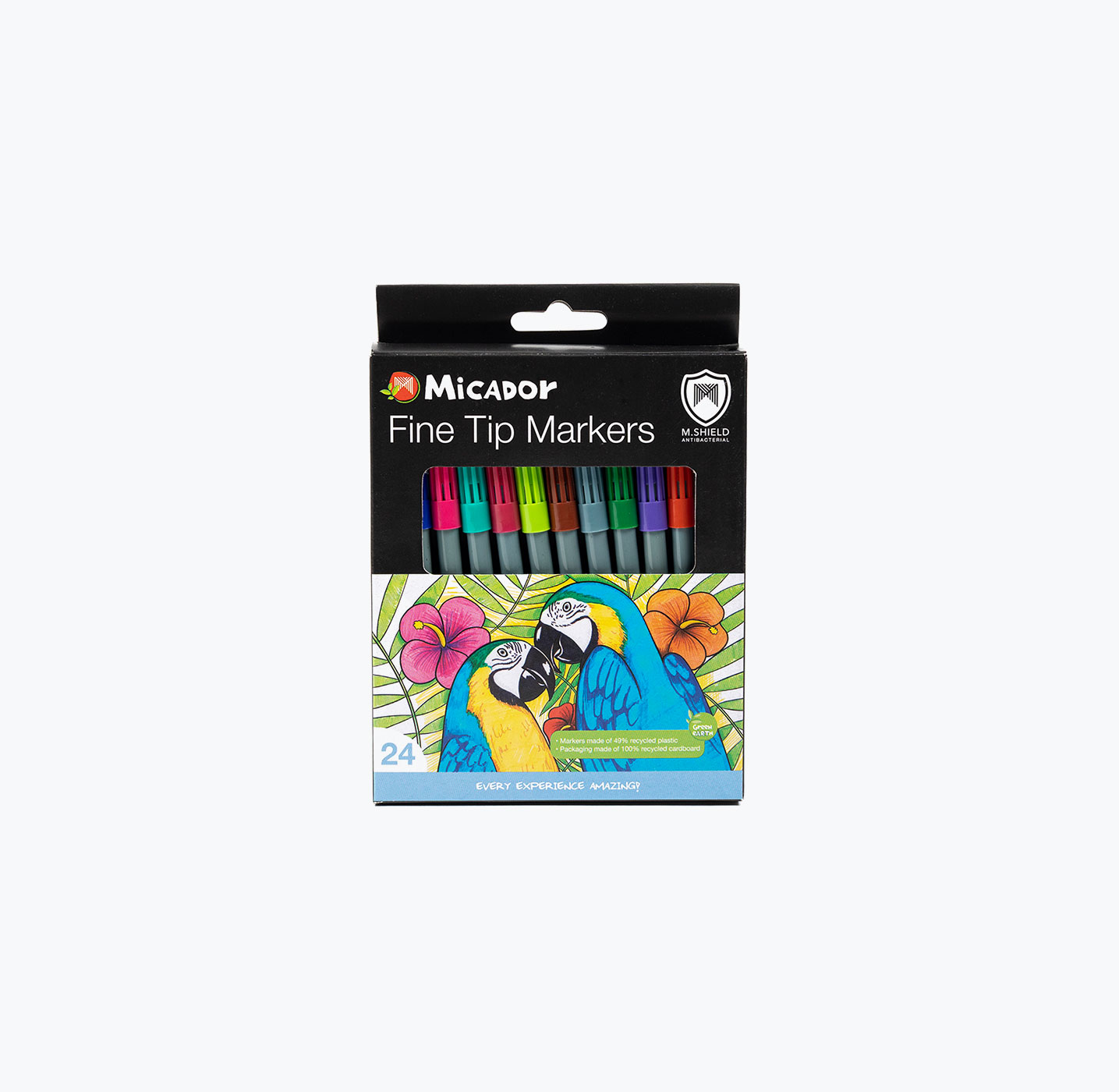 Fine Tip Markers offer vibrant colour on paper and can be used for writing or drawing. Includes M.SHIELD disinfectant additives to kill bacteria, as well as featuring ventilated caps for safety and sink resistant nibs for longevity. Ideal for the home or classroom and available in a pack of 12 or 24.