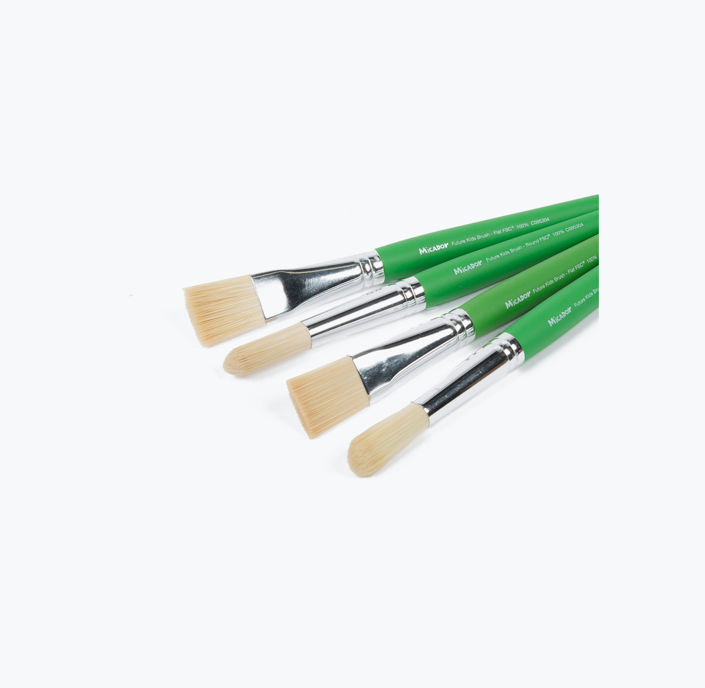 A great kids' brush pack with 2 round and 2 flat synthetic bristle brushes. Tested to last more than 12 times as long as hog hair, making them great value. Can be used for oil, acrylic, poster colour and general purpose work. Made from FSC 100% certified wood and part of Micador's green eARTh collection.