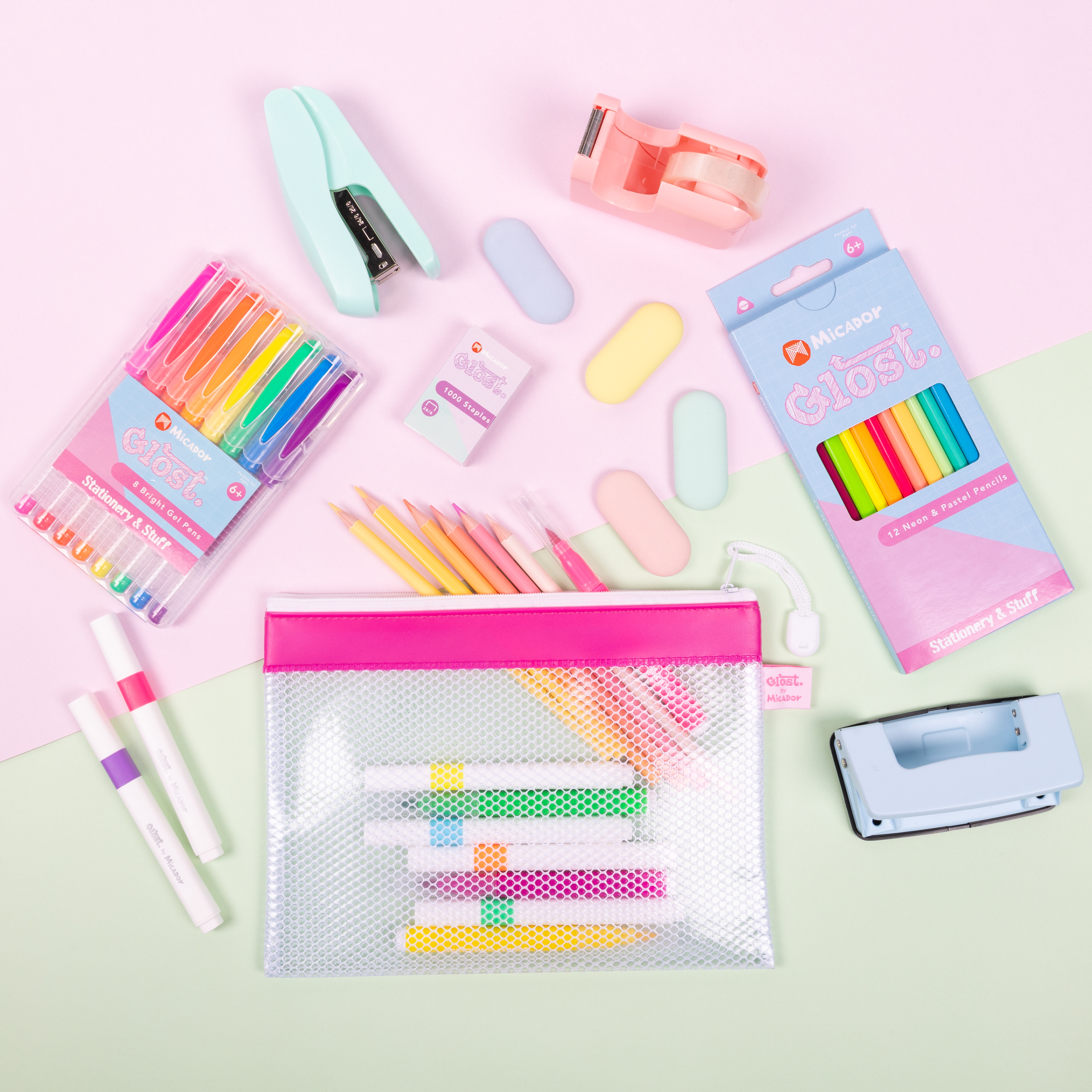Never waste time looking for your desk accessories again. With this all-in-one Glost School Tool Set, you'll have everything you need at your fingertips. Need to staple a document? Boom! Stick on a label? Bam! Punch a hole? Pow! Embrace the day and organise your homework the easy way. Includes stapler with 1,000 staples, tape dispenser and a roll of tape, plus a hole punch. Packaging contains FSC™ Mix certified paper too.