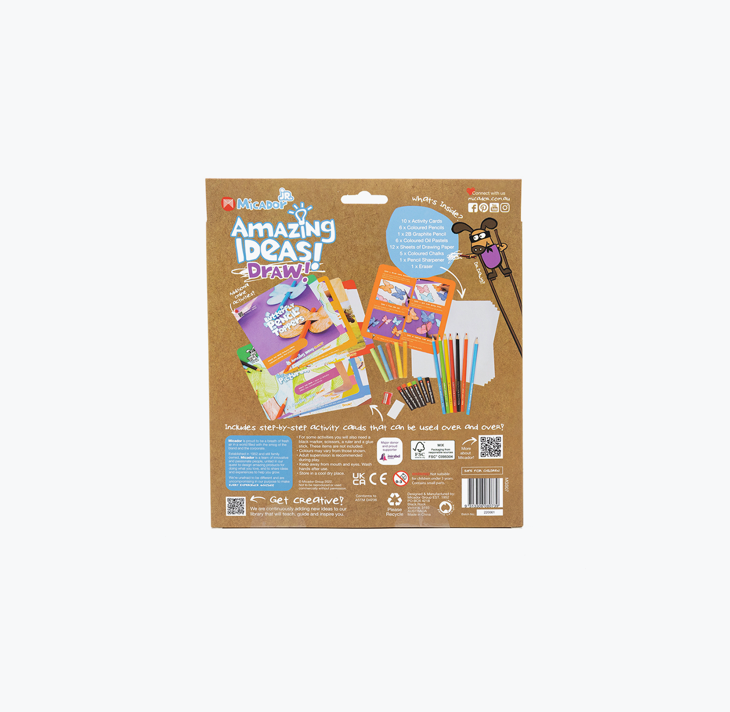 - Draw features activity cards, pencils, paper and cardboard packaging that is FSC™ Mix