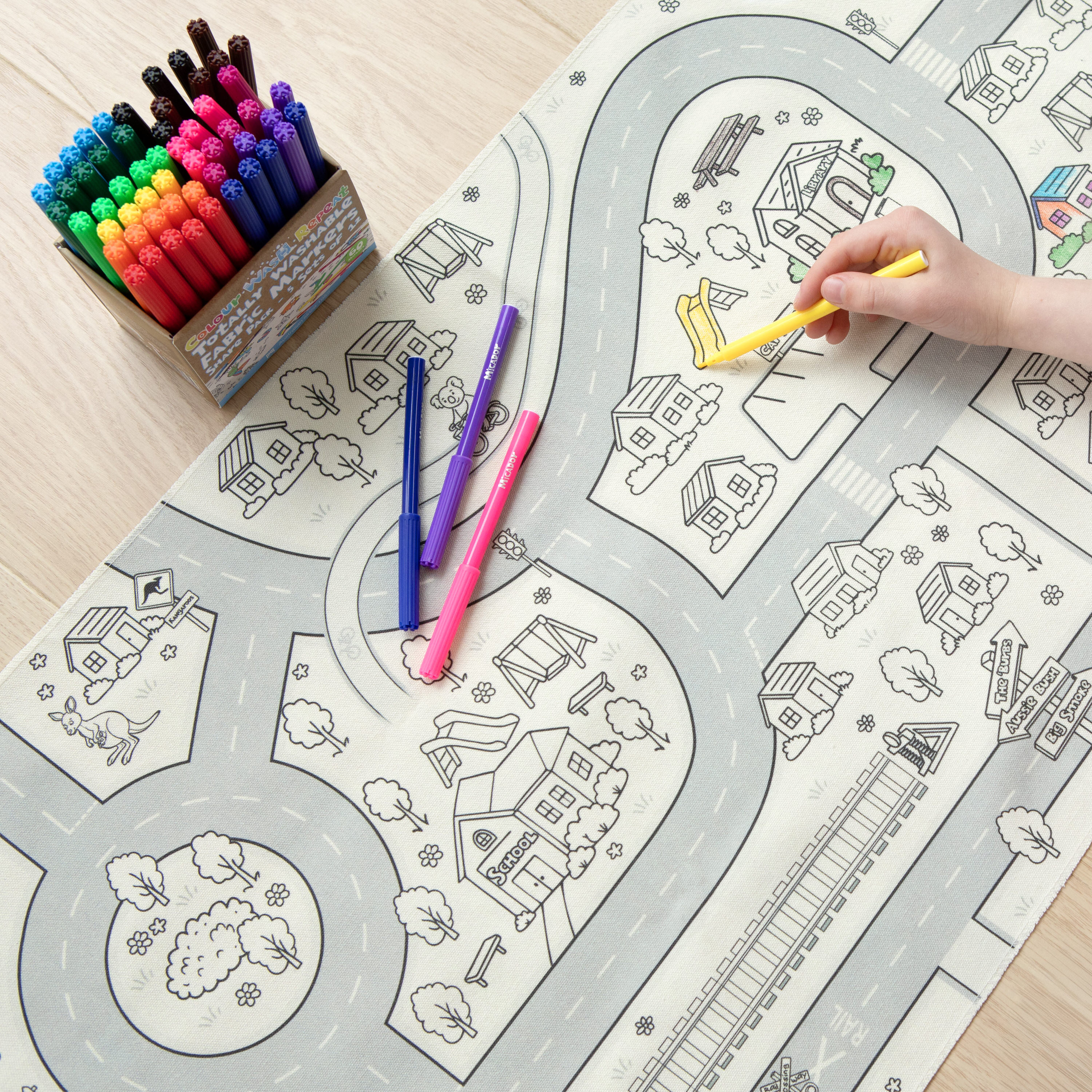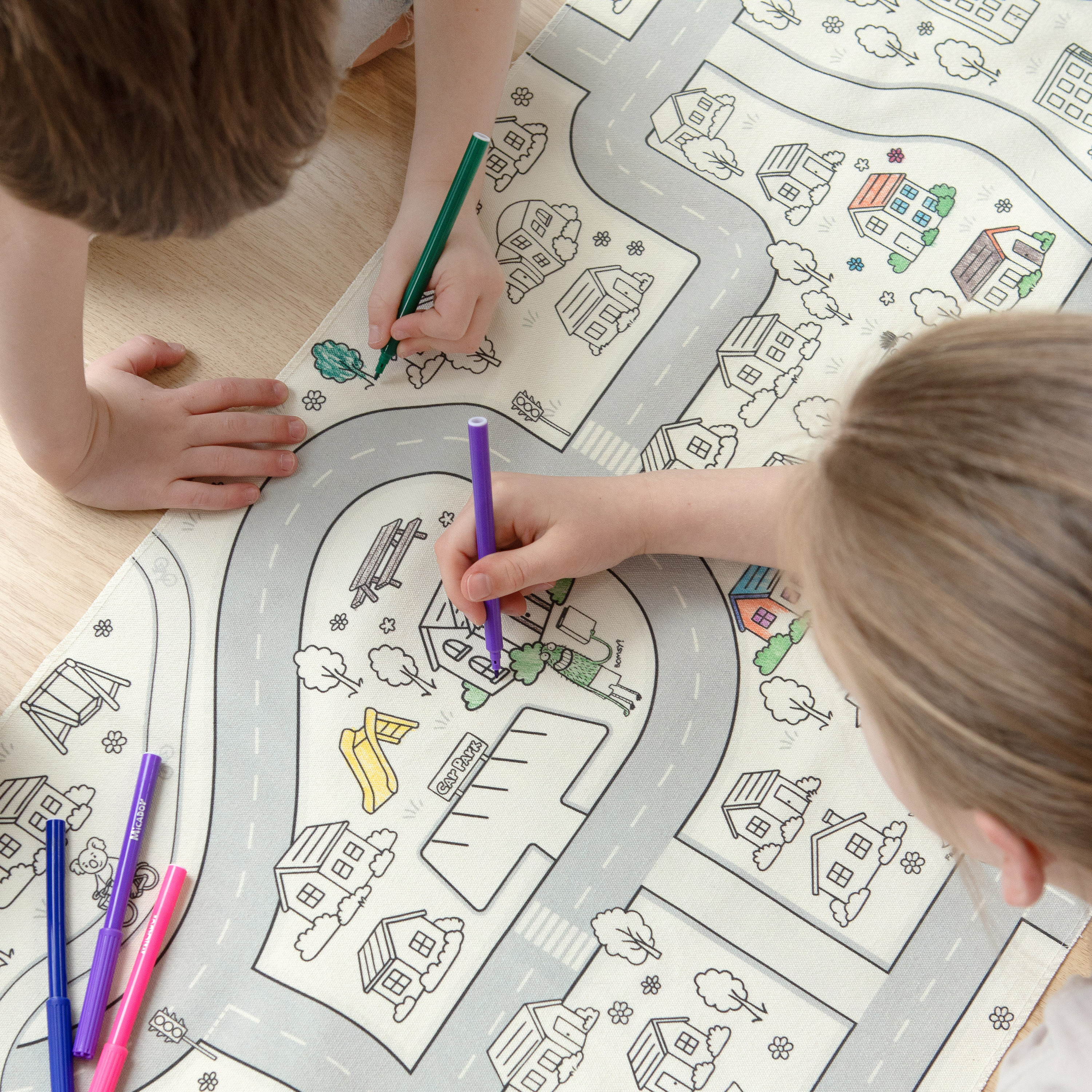 The neighbourhood just became your canvas (and your table survived). This large-scale interactive street play canvas (150 x 45cm) combines colouring with imaginative play - kids colour the buildings and roads, then bring their city to life with toy cars and wild stories. Hours of screen-free entertainment that actually works, and when they are ready to redesign the whole neighbourhood, everything washes clean at 40°C. Includes 12 totally washable kids fabric markers and rolls up for adventures beyond the dining room.