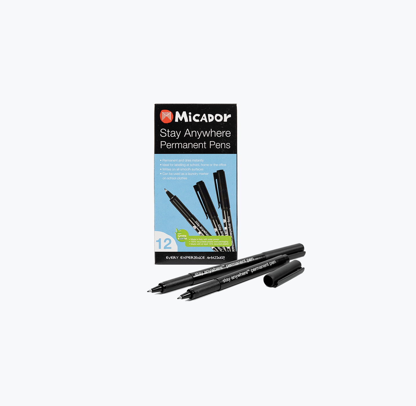 Ideal for the home, school or to label school uniforms, Stay Anywhere Permanent Pens are a must-have for every household. Pens dry instantly and stay permanent. Can be used for detail work over coloured media, and write on most surfaces.