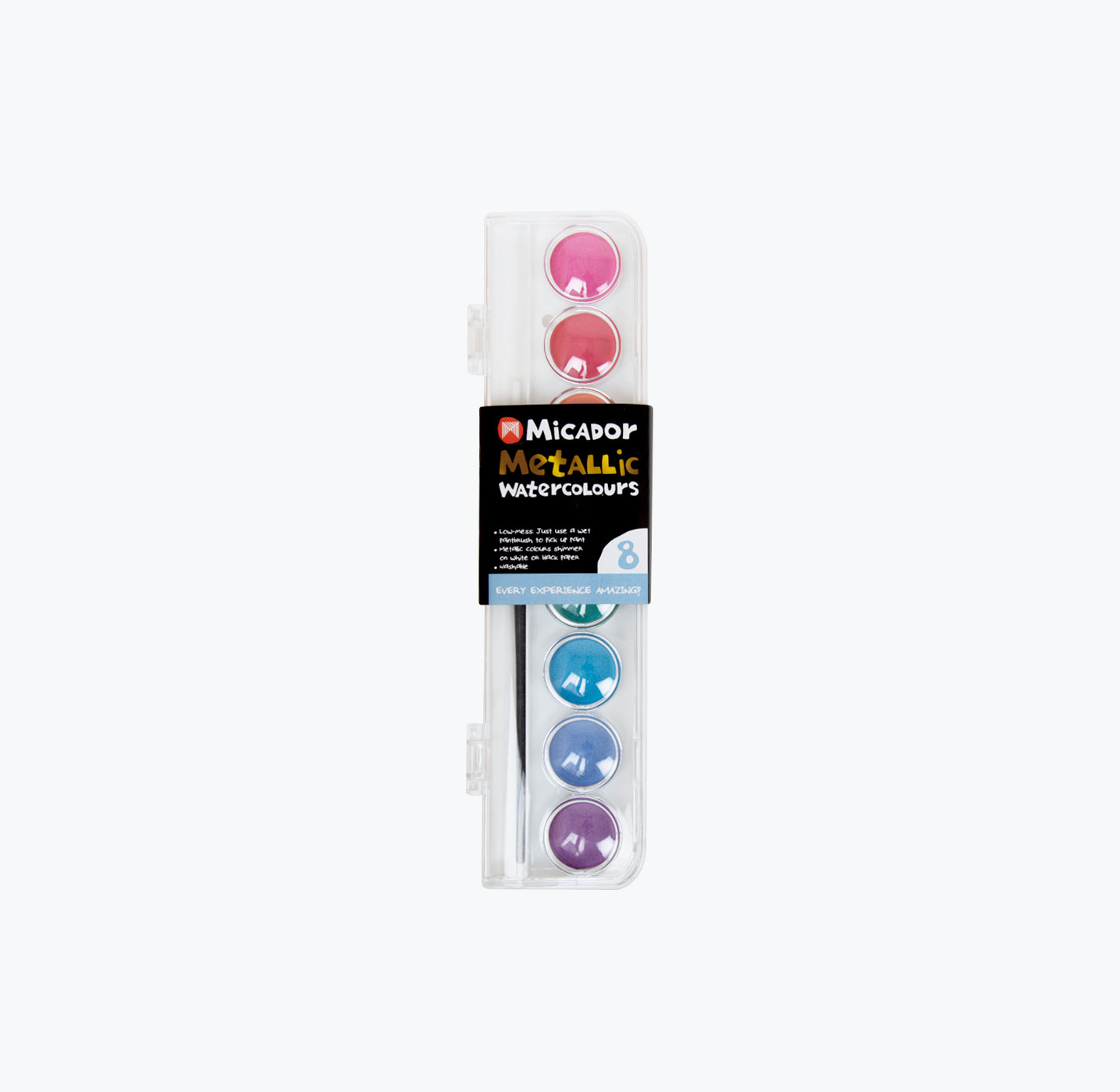 - Watercolour palette with 8 metallic colours