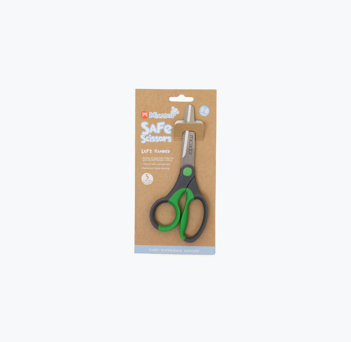 These high quality 130mm scissors are a pencil case must-have! Steel blades with double ground edges offer sharpness for precision cutting, while rounded ends with 80 degree opening ensures safety for young hands. Available in left and right styles, and with comfortable, soft touch rubber, Safe Scissors sure are a safe bet for Back to School and beyond.
