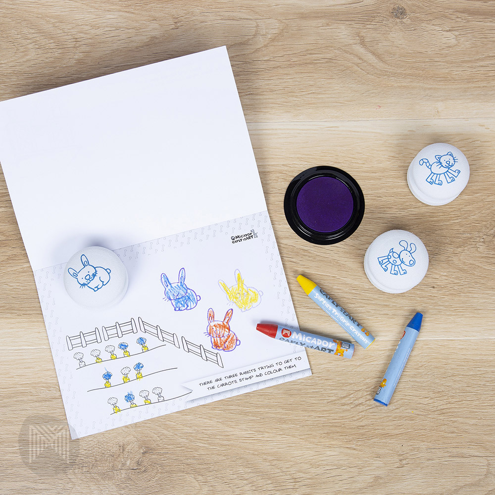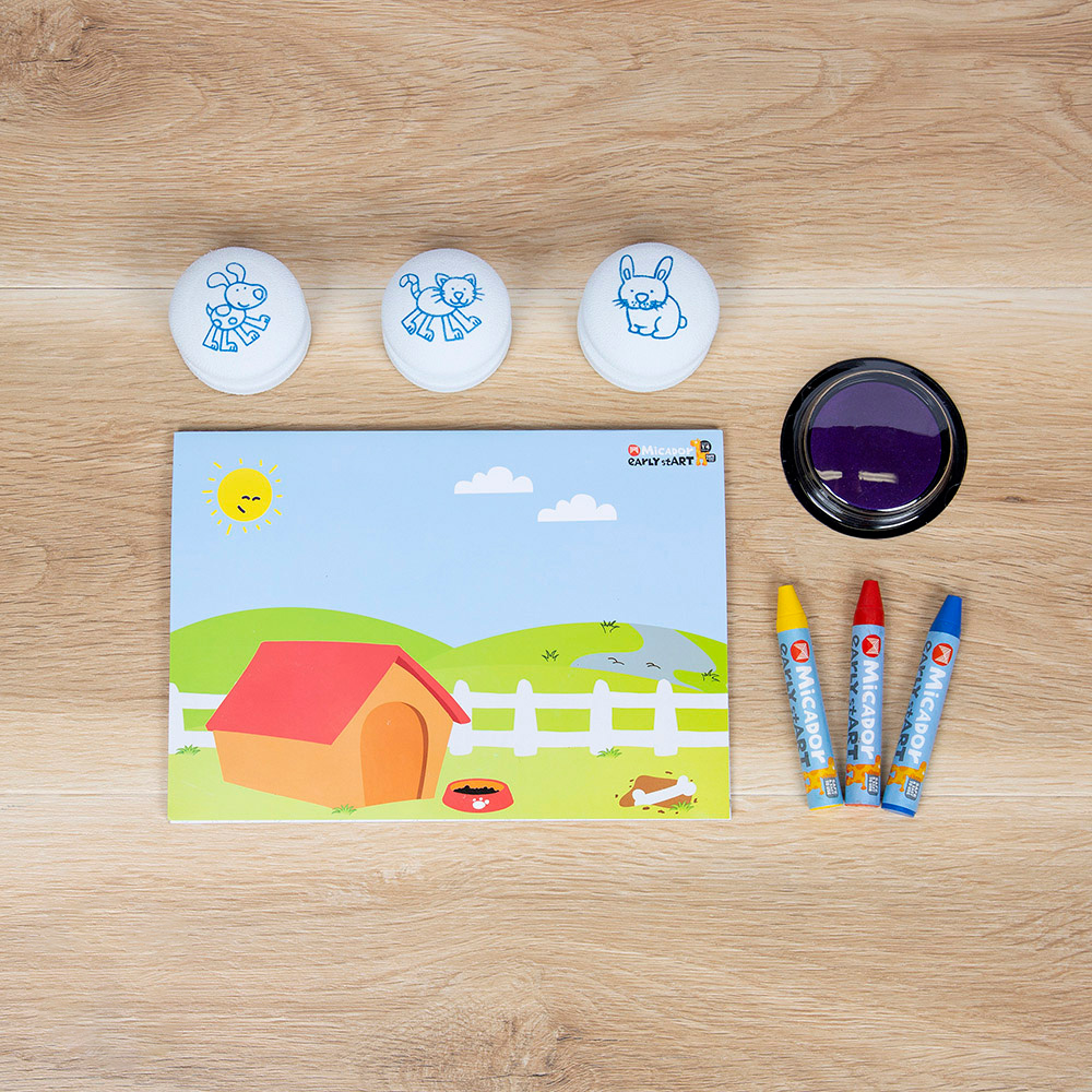 - Each set includes 3 stamps, a washable ink pad, 20 activity sheets and 3 crayons