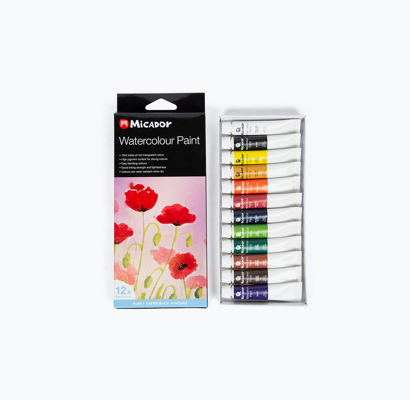 12 tubes of transparent watercolour paint with good lightfastness. High pigment content for strong colurs and easy blending capabilities for professional or hobby work. Colours are water resistant when dry.